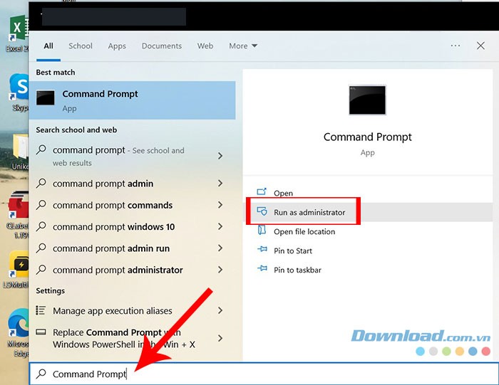 Bước 1: Hãy bắt đầu bằng cách nhấp vào biểu tượng Windows để mở menu Start. Tiếp theo, nhập lệnh và chọn Run as administrator từ danh sách kết quả hiển thị ở phía bên phải.
