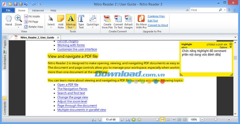 Nitro Reader cung cấp các chức năng để thêm ghi chú ảo bất cứ nơi nào trong tài liệu. Các ghi chú có thể được hiển thị hoặc ẩn theo ý muốn, cung cấp cho bạn một phương tiện làm nổi bật khu vực cụ thể hoặc những hướng dẫn đặc biệt trong tài liệu.