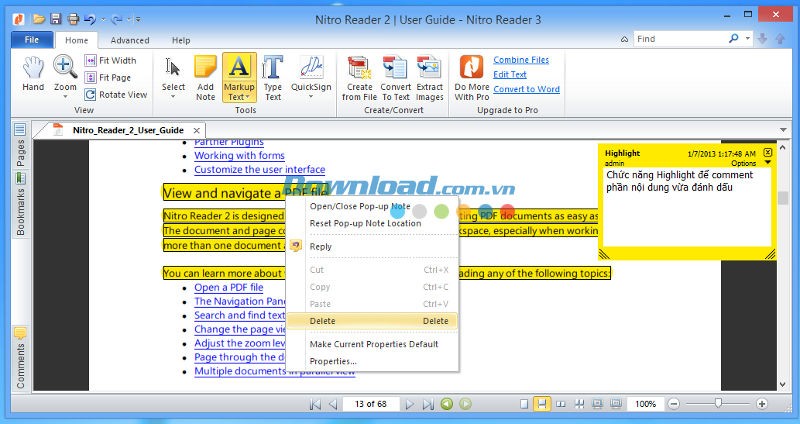 Nitro Reader cho phép bạn trả lời riêng cho mỗi bình luận hoặc chú thích trong tài liệu.