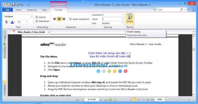 Bên cạnh việc chú thích, Nitro Reader còn cho phép bạn chèn thêm văn bản trực tiếp vào file PDF. Hãy chọn Text Type từ menu, sau đó nhấp chuột vào vị trí muốn chèn văn bản và bắt đầu nhập nội dung. Để hoàn tất, nhấn vào nút Finish trên menu.