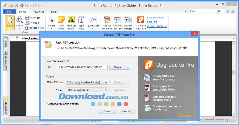 Nitro Reader cung cấp chức năng tạo PDF từ bất kỳ tập tin nào, với các cấu hình được xác định trước, cũng như tùy chỉnh các tùy chọn đầu ra.