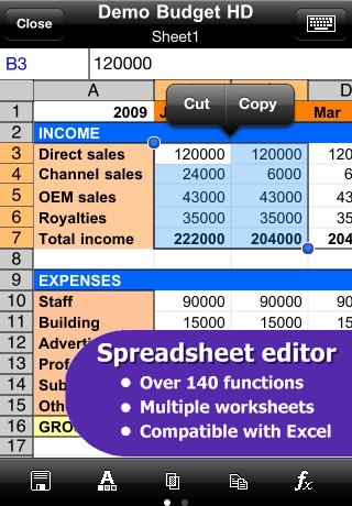 Office2 tận dụng tối đa màn hình cảm ứng của iPhone, cho phép người dùng thao tác chọn và kéo để điều chỉnh chiều cao dòng, chiều rộng cột, cũng như nhập công thức tính toán trực tiếp vào các ô.