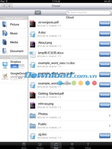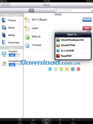 Ứng dụng hỗ trợ dịch vụ đám mây Google Docs và Dropbox với các chức năng tải lên, tải xuống và đồng bộ hóa file. Các dịch vụ lưu trữ trực tuyến khác cũng sẽ được bổ sung trong tương lai.