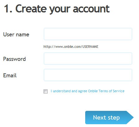 Để bắt đầu, hãy truy cập trang web của Onbile và nhấp vào nút Get started now. Bạn sẽ được chuyển hướng đến trang đăng ký tài khoản. Hãy điền đầy đủ thông tin cần thiết như Username, Password, Email và xác nhận bạn đã đọc và đồng ý với các điều khoản dịch vụ bằng cách đánh dấu vào ô I understand and agree Onbile Terms of Service. Sau đó, nhấn Next step.