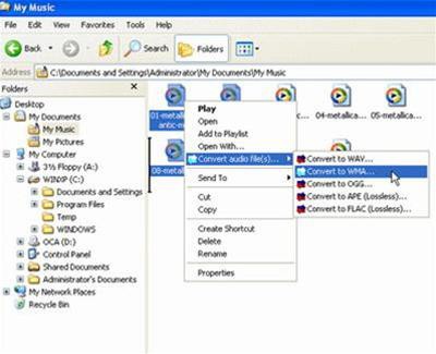 Chỉ cần nhìn thấy file nhạc trong bất kỳ ứng dụng nào, bạn chỉ cần click chuột phải vào file đó. Một menu con với tên “Convert audio file” sẽ xuất hiện. Khi di chuột đến menu này, các tùy chọn chuyển đổi file MP3 sang các định dạng như WAV, WMA, OGG, APE, FLAC… sẽ được hiển thị.