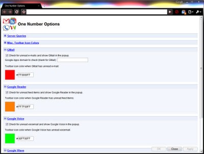 One Number là một tiện ích mở rộng hữu ích dành cho trình duyệt Google Chrome, hỗ trợ người dùng dễ dàng và nhanh chóng nắm bắt số lượng tin nhắn chưa đọc trong các dịch vụ như Gmail, Wave, Voice và Google Reader.