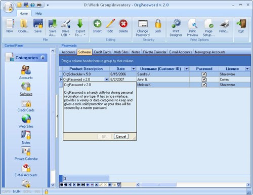 OrgPassword 3.4 là công cụ tối ưu để bảo mật thông tin cá nhân của bạn một cách tuyệt đối. Phần mềm này được thiết kế với các danh mục riêng biệt, mỗi danh mục phục vụ cho việc lưu trữ một loại thông tin cụ thể, giúp bạn dễ dàng tìm kiếm dữ liệu cần thiết một cách nhanh chóng.