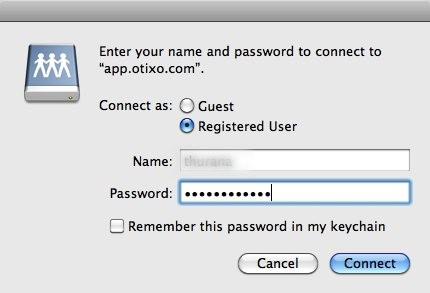 Nhập https://app.otixo.com/webdav vào trường server address và nhấn nút Connect.