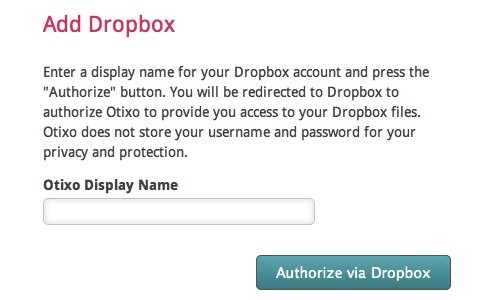 Để thêm một dịch vụ đám mây, bạn chọn biểu tượng tương ứng của dịch vụ đó trong danh sách. Otixo sẽ yêu cầu bạn nhập một tên hiển thị (Display Name) cho tài khoản. Bạn có thể tùy ý đặt tên, nhưng nên chọn một tên dễ nhận biết để thuận tiện cho việc quản lý sau này.