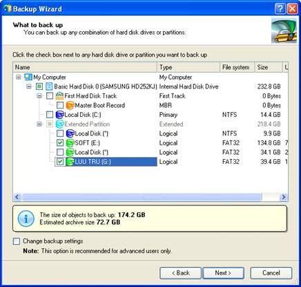 Trong cửa sổ tiếp theo, chọn các phân vùng hoặc ổ đĩa mà bạn muốn sao lưu dữ liệu. Bạn cũng có thể sao lưu Master Boot Record (MBR) của ổ đĩa để phục hồi trong trường hợp xảy ra lỗi, sau đó nhấn Next để tiếp tục.