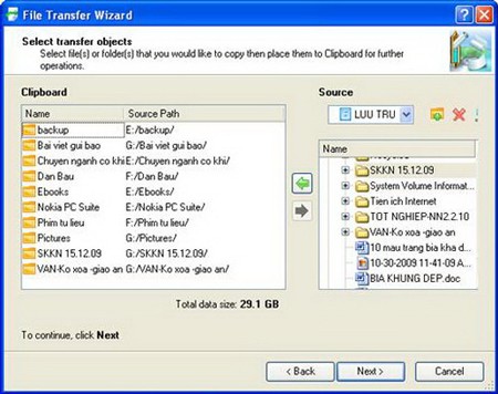 Với lựa chọn Transfer Files, bạn có thể di chuyển dữ liệu từ nhiều nguồn lưu trữ khác nhau đến một ổ đĩa trong hệ thống mạng nội bộ hoặc ghi dữ liệu ra ổ CD/DVD một cách thuận tiện. Tất cả thông tin dữ liệu muốn di chuyển sẽ được lưu trữ trong bộ nhớ clipboard của hệ thống, vì vậy bạn cần đảm bảo dung lượng bộ nhớ còn đủ.