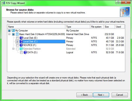 Để bắt đầu quá trình chuyển đổi, tại hộp thoại Browse for source disks, hãy chọn các phân vùng ổ đĩa mà bạn muốn đưa vào máy ảo (ví dụ: phân vùng chứa hệ điều hành Windows), sau đó nhấn Next.