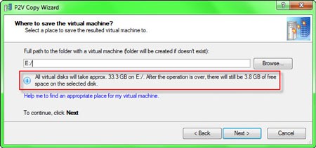 Trong bước tiếp theo, bạn nhấn Browse tại hộp thoại Where to save the virtual machine và chọn một thư mục trên ổ đĩa có đủ dung lượng trống để lưu trữ file đĩa ảo. Dung lượng cần thiết của file ảo sẽ phụ thuộc vào dung lượng ổ đĩa vật lý và được hiển thị tại dòng All virtual disks will take approx. xGB (x là tổng dung lượng của máy ảo). Cuối cùng, nhấn Next và chờ đợi chương trình tạo file máy ảo. Trong quá trình thử nghiệm, khi chuyển đổi phân vùng cài Windows 7 (dung lượng 33,3GB), thời gian xử lý của Paragon Go Virtual mất khoảng 1 giờ 13 phút.