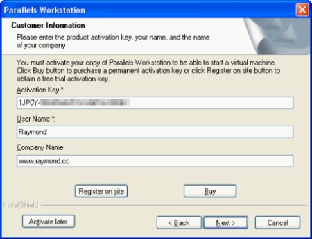 6. Nhập key kích hoạt Parallels Workstation mà bạn đã nhận được qua email. Không cần nhập tên người dùng.