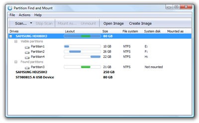 Giao diện chính của phần mềm khá đơn giản với thanh menu chỉ gồm 3 mục và thanh công cụ 6 mục, tương ứng với các chức năng trên thanh menu để thao tác nhanh chóng. Sau khi quét các ổ đĩa (phân vùng), phần mềm sẽ hiển thị các phân vùng đã bị xóa, cho phép bạn chọn mount chúng lên để xem và trích xuất dữ liệu.
