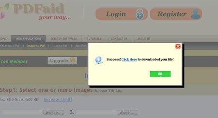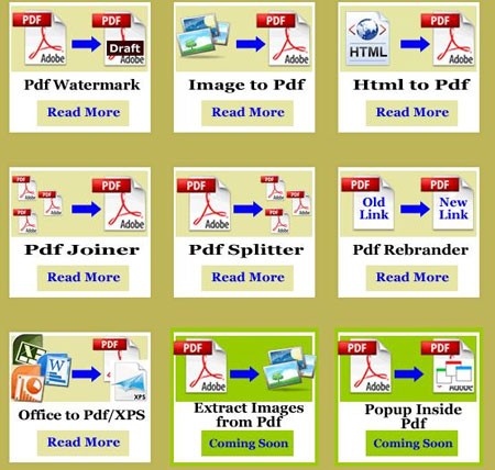 PDFaid không bắt buộc người dùng phải đăng ký tài khoản. Chỉ cần truy cập vào địa chỉ http://pdfaid.com/, bạn sẽ ngay lập tức thấy 9 biểu tượng đại diện cho 3 chức năng chính: chuyển đổi, tạo và trích xuất PDF. Cụ thể, có 6 tùy chọn bao gồm Pdf Watermark (chuyển PDF sang dạng ảnh mờ), Image to Pdf (chuyển ảnh sang PDF), Html to Pdf (chuyển mã web sang PDF), Office to Pdf/XPS (chuyển tài liệu văn phòng sang PDF/XPS), Extract Images from Pdf (trích xuất ảnh từ file PDF) và Popup Inside Pdf (tạo popup bên trong PDF).