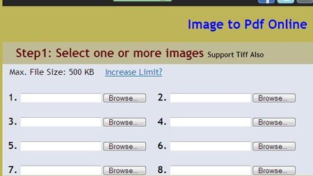 Tùy thuộc vào mục đích sử dụng, bạn có thể chọn một tùy chọn phù hợp. Trong bài viết này, chúng ta sẽ thử nghiệm với tùy chọn Image to Pdf. Đầu tiên, bạn cần tải lên các hình ảnh cần chuyển đổi. Ứng dụng cho phép tải tối đa 8 ảnh bằng cách nhấn vào nút Browse... phía sau mỗi ô trống.