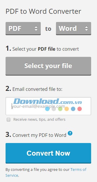 Truy cập trang chủ của dịch vụ, nhấn nút Browse để chọn file PDF cần chuyển đổi. Tại trường Convert PDF file to, chọn mục .DOC.