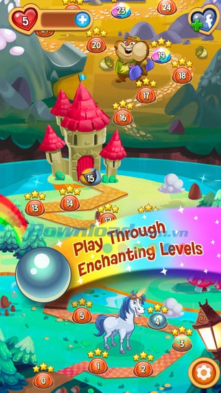 Khám phá bản đồ game cùng chú ngựa trắng đáng yêu, một thế giới rộng lớn chứa đựng nhiều bí mật đang chờ bạn khám phá – từ con tàu của những tên cướp biển cho đến nhà hát Opera trong hang động của Madame Batrina... Đạt được thứ hạng cao và nhận những phần thưởng hấp dẫn bằng cách vượt qua tất cả các cấp độ trong Peggle Blast. Âm nhạc sống động được lồng ghép vào game, biến mỗi pha bắn bi trở thành một trải nghiệm khó quên!