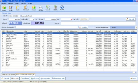Quản lý học phí và chi phí tài liệu, áp dụng các chính sách giảm giá cho từng lớp học.