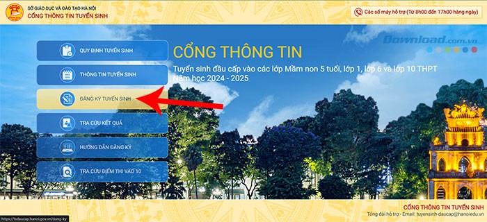 Bước 1: Để thực hiện đăng ký tuyển sinh, trong khoảng thời gian xét tuyển cho cấp học của con em bạn, như đã thông báo trước đó, phụ huynh cần truy cập vào Cổng thông tin đăng ký tuyển sinh và chọn vào mục Đăng ký tuyển sinh.