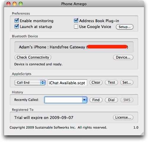 Phone Amego là một ứng dụng nhỏ gọn, được thiết kế để tích hợp liền mạch iPhone hoặc các thiết bị điện thoại hỗ trợ Bluetooth với máy tính Mac và các dịch vụ của Google Voice.