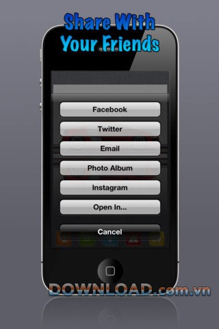 Chia sẻ ảnh đã chỉnh sửa trở nên đơn giản hơn bao giờ hết với các tùy chọn tích hợp sẵn như Facebook, Twitter (hỗ trợ iOS 5) và Email.