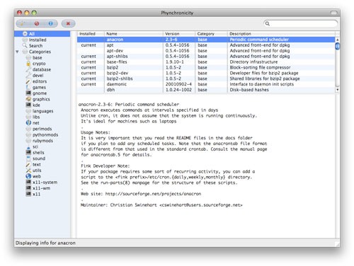 Phynchronicity là một giao diện đồ họa người dùng (GUI) được thiết kế cho gói phần mềm quản lý hệ thống Fink Unix trên hệ điều hành Mac OS X. Fink là một công cụ dòng lệnh mạnh mẽ, hỗ trợ cài đặt và cập nhật hàng ngàn ứng dụng dựa trên nền tảng Unix dành cho máy Mac.