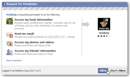 Pick&Zip sẽ yêu cầu quyền truy cập vào hình ảnh và thông tin hồ sơ của bạn, đồng thời cần một địa chỉ email để xác nhận. Hãy nhấp Allow để cấp quyền cho Pick&Zip thu thập các thông tin này.