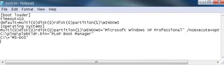 [boot loader][operating systems]c:\plop\plpbtldr.bin="Install PLoP Boot Manager"Khởi động lại máy tính. Bạn sẽ thấy dòng "Install PLoP Boot Manager" được thêm vào menu boot của Windows XP, hoặc hai dòng chọn (Vista/Win7 và Plop manager) trong Vista/Win 7.