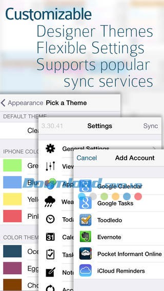 Đồng bộ hóa dữ liệu với các dịch vụ đám mây phổ biến như Google, Toodledo và Evernote .