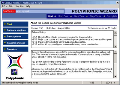 Để tạo nhạc chuông với Polyphonic Wizard, bạn cần chọn kiểu điện thoại đang sử dụng, sau đó thêm file nhạc MIDI từ máy tính. Tiếp theo, bạn có thể cắt, chỉnh sửa và nghe thử trước khi tải nhạc vào điện thoại qua cáp, cổng hồng ngoại hoặc WAP.