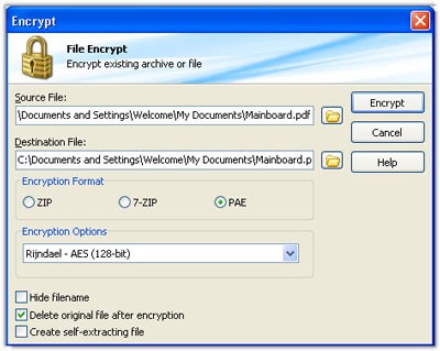 Nếu bạn muốn chia sẻ file mã hóa với người khác không cài đặt PA 2010, hãy đánh dấu vào ô Create self-extracting file (chỉ có ở định dạng PAE). Cuối cùng, nhấp Encrypt và nhập mật khẩu hai lần để hoàn tất.