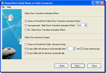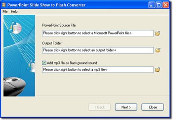 PowerPoint Slide Show to Flash Converter là phần mềm chuyên dụng, được thiết kế để chuyển đổi các tập tin trình chiếu PowerPoint (PPT) sang định dạng Flash SWF. SWF là một định dạng độc lập, tương thích rộng rãi trên nhiều nền tảng.