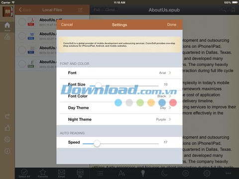 Khi đang mở một văn bản eBook, chạm vào giữa màn hình để hiển thị thanh công cụ. Sau đó, chạm vào biểu tượng thiết lập để tùy chỉnh trình đọc eBook. Bạn có thể điều chỉnh theme, kích thước chữ, màu sắc, tốc độ đọc tự động, lề trang và khoảng cách dòng chữ.