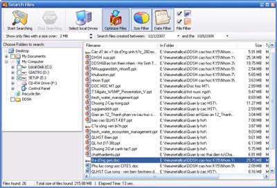 Thẻ Search files cung cấp một công cụ tìm kiếm file hiệu quả, giúp bạn dễ dàng tìm thấy các tập tin cần thiết trên các thư mục hoặc ổ đĩa theo kích thước (Size filer) hoặc thời gian (Date filter). Kết quả sẽ hiển thị chi tiết về số lượng file tìm được và tổng dung lượng file. Bạn có thể chọn và tối ưu hóa kích thước các file này một cách nhanh chóng.