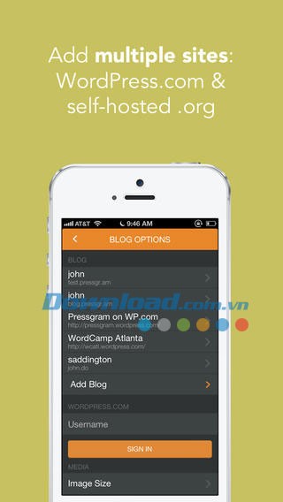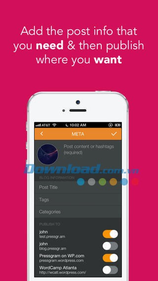 Pressgram for iOS cho phép chụp ảnh, thêm bộ lọc và đăng tải lên trang WordPress tự quản (WordPress.org ) hoặc trang WordPress.com .
