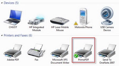 Sau khi cài đặt hoàn tất, một máy in ảo có tên PrimoPDF sẽ được thêm vào danh sách máy in. Máy in này thường sẽ tự động được thiết lập làm máy in mặc định. Tuy nhiên, nếu bạn muốn sử dụng một máy in khác cho việc in ấn thông thường hoặc chọn PrimoPDF làm máy in mặc định, bạn hãy truy cập Start > chọn Devices and Printers > nhấp chuột phải vào tên máy in bạn muốn đặt làm mặc định > và chọn Set as default printer.