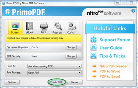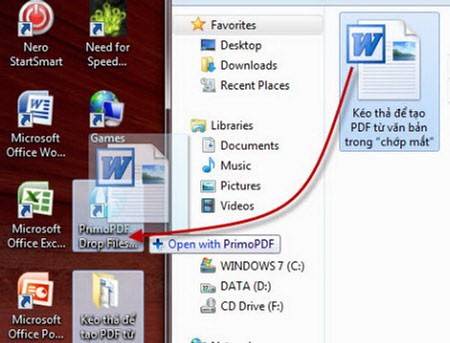 Ngoài ra, PrimoPDF còn cho phép bạn tạo nhanh file PDF từ các file văn bản đã có sẵn. Thao tác này rất đơn giản: chỉ cần kéo và thả file văn bản vào biểu tượng PrimoPDF - Drop Files Here to Convert! trên màn hình. Chương trình sẽ tự động mở file văn bản gốc và bắt đầu quá trình in sang PDF, lưu file PDF tương ứng vào thư mục chứa file gốc.