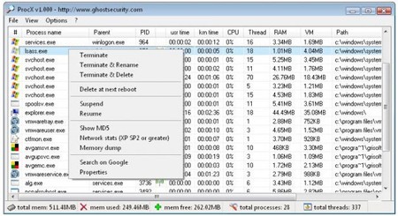 ProcX cung cấp các chức năng như tra cứu thông tin chương trình đang chạy thông qua Google và kiểm tra mã MD5 của chương trình.