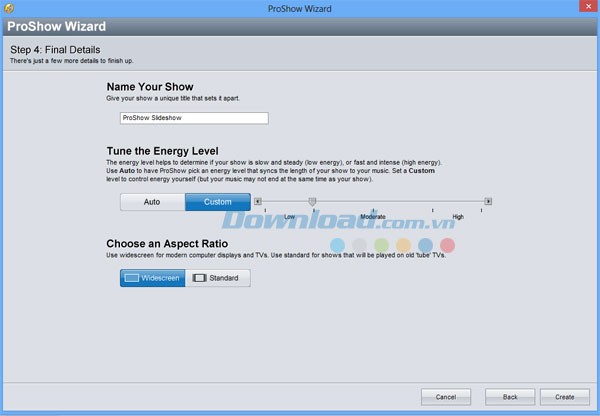 Đặt tên cho trình chiếu, điều chỉnh mức năng lượng và chọn tỷ lệ video phù hợp. Một cửa sổ xem trước sẽ xuất hiện, cho phép bạn kiểm tra kết quả. Nếu hài lòng, chọn "". Nếu chưa ưng ý, nhấn "" để tạo lại trình chiếu.