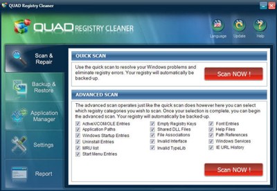 QUAD Registry Cleaner là phần mềm tự động phát hiện và quét các mục đăng ký không hợp lệ, các phím tắt, chương trình và tập tin bị hỏng có thể gây hại cho máy tính và gây ra lỗi crashes.