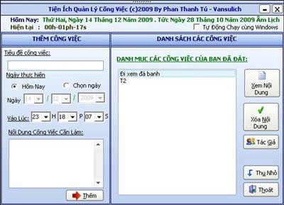 Sau khi tải và giải nén, bạn chỉ cần nhấp đúp vào file để khởi động chương trình. Giao diện phần mềm được chia thành hai khu vực chính: khu vực lịch hẹn, nơi bạn có thể thiết lập nội dung, đặt lịch và hẹn giờ, và danh sách công việc đã được lưu lại.