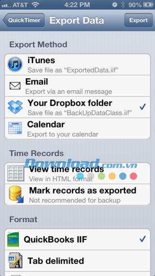 QuickTimer Lite for iOS có khả năng tương thích với QuickBooks cùng nhiều ứng dụng khác. Đây cũng là tiện ích tiên phong trên App Store với tính năng xuất file bộ đếm giờ IIF gốc.