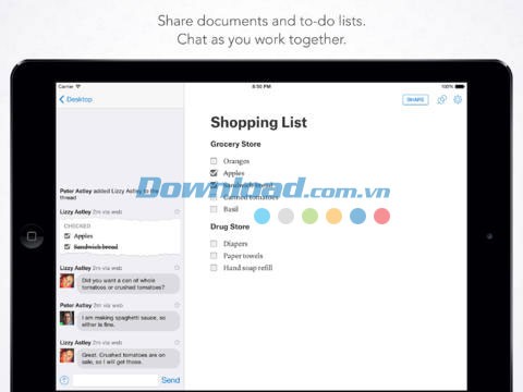 Cho dù đội của bạn nhỏ hay lớn, việc tổ chức mọi nội dung công việc đều không hề đơn giản. Với ứng dụng Quip for iOS, bạn có thể dễ dàng tạo bản nháp cho một đề án cùng nhau hoặc hỏi những người đang online. Bạn có thể tạo một thư mục chia sẻ trong công ty để tài liệu của mình được truy cập dễ dàng bởi mọi người, ở bất cứ đâu và thậm chí cả khi offline.
