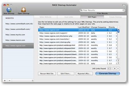 RAGE Sitemap Automator được đánh giá cao nhờ sự đơn giản, gọn nhẹ và giao diện trực quan, dễ sử dụng. Việc ứng dụng XML Sitemaps – một giao thức mở được chấp nhận rộng rãi bởi hầu hết các search engine – đảm bảo website của bạn sẽ được các công cụ tìm kiếm như Google, Yahoo, MSN và Ask.com thu thập dữ liệu một cách hiệu quả.