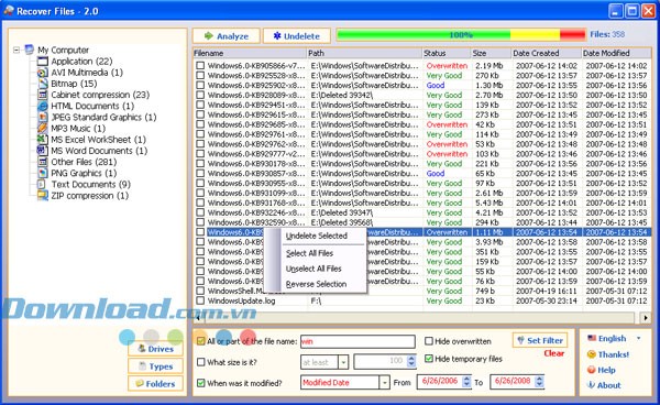 Để nhanh chóng xác định tập tin cần phục hồi, bạn có thể nhấp vào các kiểu tập tin ở khu vực bên trái. Khu vực bên phải sẽ chỉ hiển thị các tập tin có phần mở rộng tương ứng với kiểu bạn đã chọn.