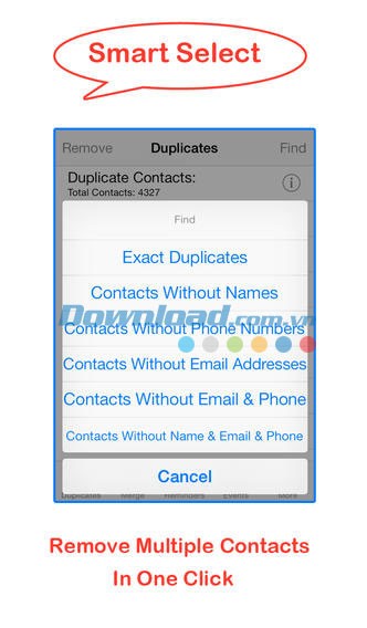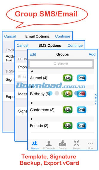 Bên cạnh việc loại bỏ trùng lặp, Remove Duplicate Contacts and Events còn cung cấp khả năng quản lý nhóm một cách hiệu quả. Bạn có thể dễ dàng gửi tin nhắn SMS và email hàng loạt trực tiếp từ điện thoại thông minh và máy tính bảng iDevice của mình.