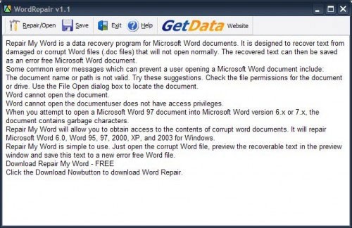 Repair My Word là một ứng dụng miễn phí được thiết kế để khôi phục các file Microsoft Word bị hỏng. Phần mềm này tương thích với các phiên bản Word 6.0, 95, 97, 2000, XP và 2003.