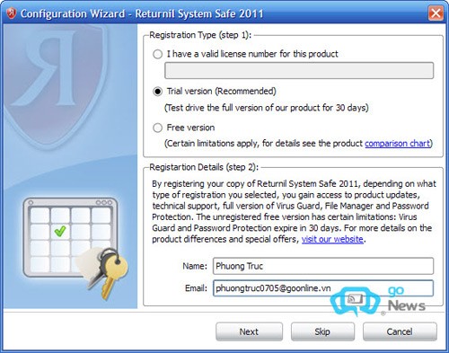 Trong quá trình cài đặt, khi đến hộp thoại Configuration Wizard, hãy chọn ô Trial version để trải nghiệm đầy đủ các tính năng của chương trình trong vòng 30 ngày. Điền thông tin đăng ký (tên và email) vào phần Registration Details, sau đó nhấn OK.
